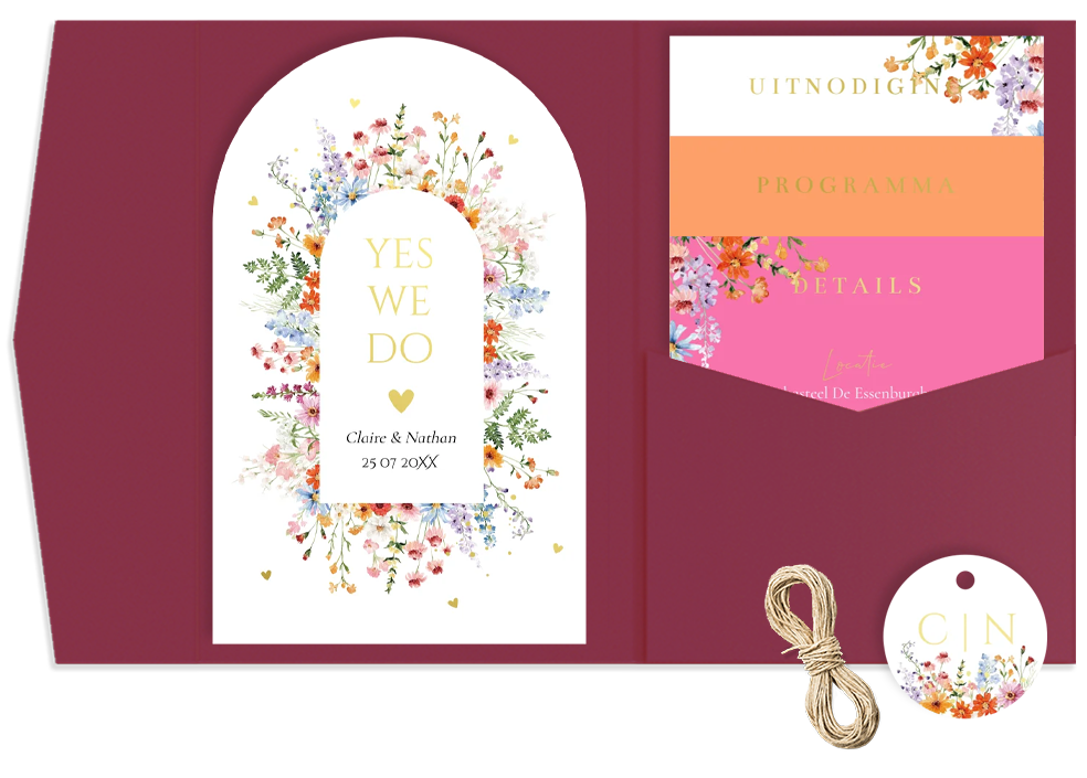 Trouwkaart pocketfold met romantische kleurrijke watercolour bloemen met trouw icoontjes en goudfolie. Bewerk alle kaartjes overzichtelijk bij elkaar in de editor en bestel de items gemakkelijk als set. Een pocketfold trouwkaart: hoe werkt het? • Eén kaart plak je aan de linker binnenzijde vast • In het vakje kun je de overige losse (foto)kaartjes kwijt • Maak de pocketfold dicht met mooi lint of touw, dit kun je er los bijbestellen. De envelop wordt automatisch in de juiste maat toegevoegd aan je winkelmand bij het bestellen van de set. Good to know: 2 postzegels * Getoonde prijzen zijn excl. de pocketfolds zelf, deze kun je tijdens het bestelproces toevoegen.