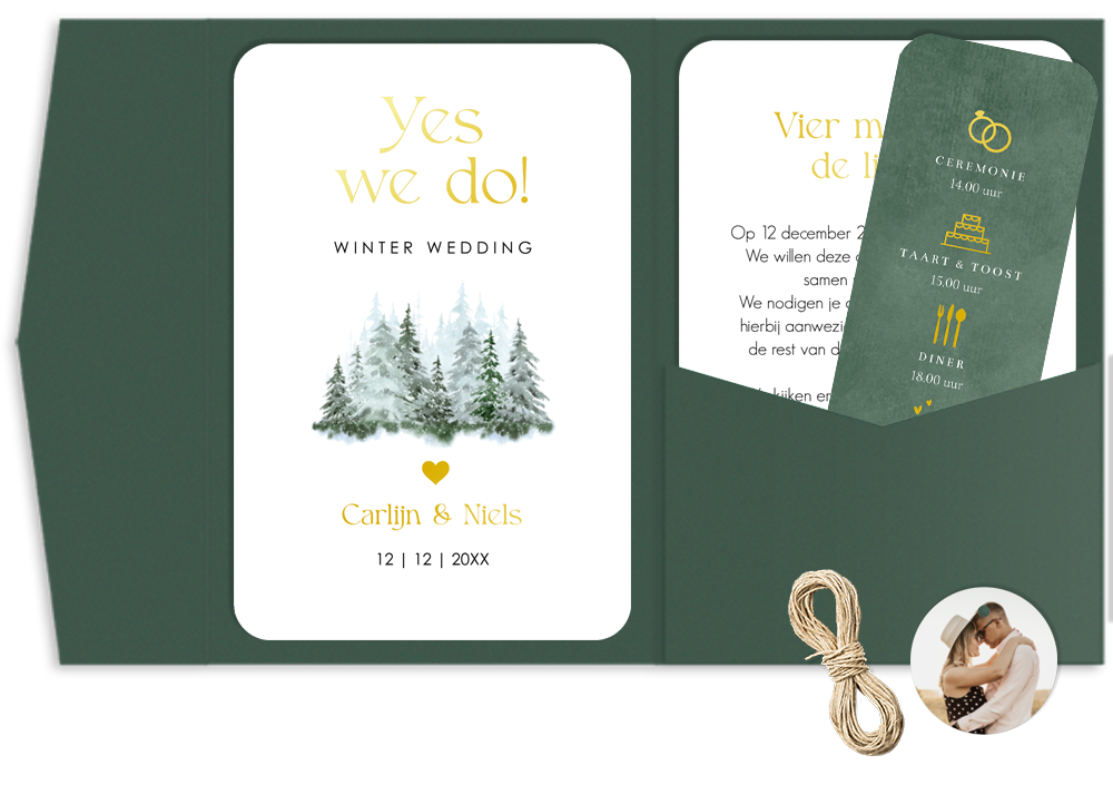 Pocketfold trouwkaart kerst winter wedding met groen landschap van bomen en goudfolie. Met trouw icoontjes en fotolabel. Bewerk alle kaartjes overzichtelijk bij elkaar in de editor en bestel de items gemakkelijk als set.