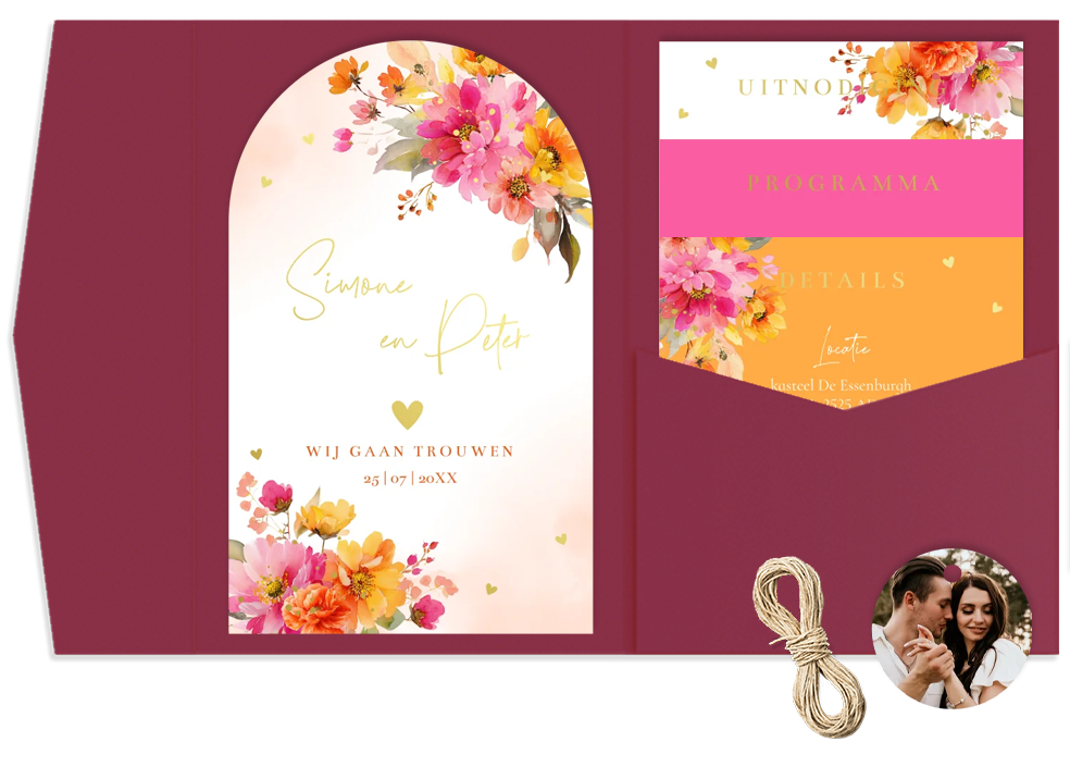 Trouwkaart pocketfold met kleurrijke watercolour bloemen roze oranje met trouw icoontjes en goudfolie. Bewerk alle kaartjes overzichtelijk bij elkaar in de editor en bestel de items gemakkelijk als set. Een pocketfold trouwkaart: hoe werkt het? • Eén kaart plak je aan de linker binnenzijde vast • In het vakje kun je de overige losse (foto)kaartjes kwijt • Maak de pocketfold dicht met mooi lint of touw, dit kun je er los bijbestellen. De envelop wordt automatisch in de juiste maat toegevoegd aan je winkelmand bij het bestellen van de set. Good to know: 2 postzegels * Getoonde prijzen zijn excl. de pocketfolds zelf, deze kun je tijdens het bestelproces toevoegen.