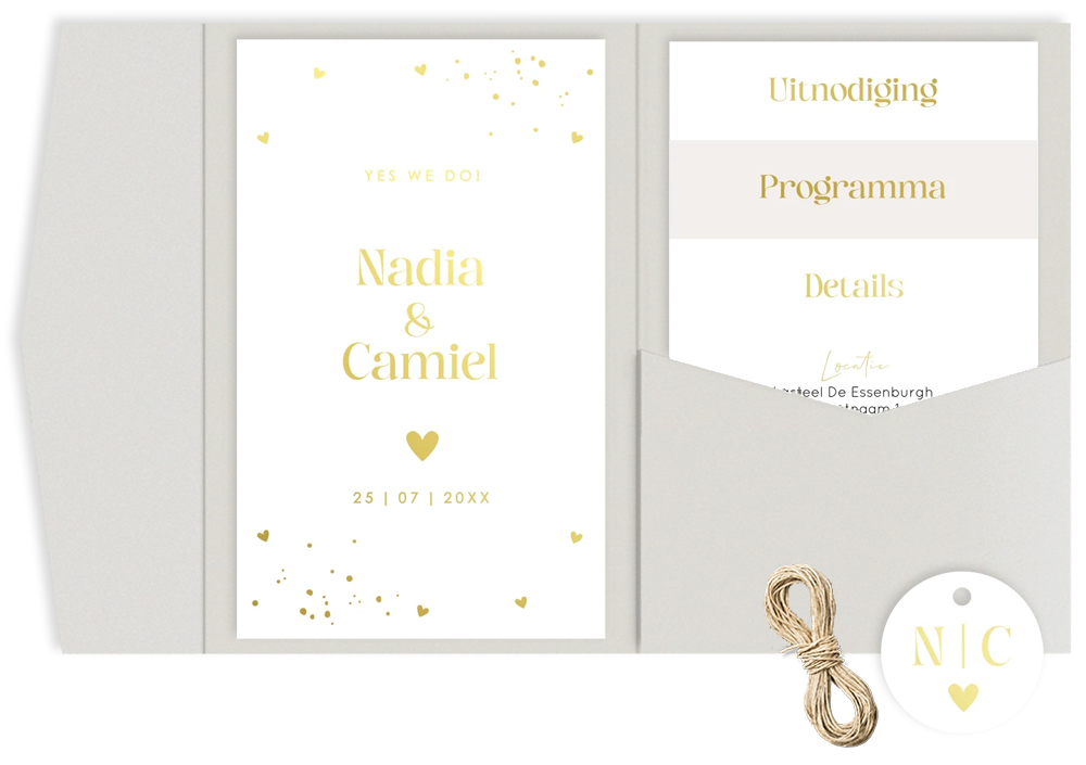 Stijlvolle pocketfold trouwkaart wit met luxe goudfolie. Bewerk alle kaartjes overzichtelijk bij elkaar in de editor en bestel de items gemakkelijk als set. Een pocketfold trouwkaart: hoe werkt het? • Eén kaart plak je aan de linker binnenzijde vast • In het vakje kun je de overige losse (foto)kaartjes kwijt • Maak de pocketfold dicht met mooi lint of touw, dit kun je er los bijbestellen. De envelop wordt automatisch in de juiste maat toegevoegd aan je winkelmand bij het bestellen van de set. Good to know: 2 postzegels * Getoonde prijzen zijn excl. de pocketfolds zelf, deze kun je tijdens het bestelproces toevoegen.