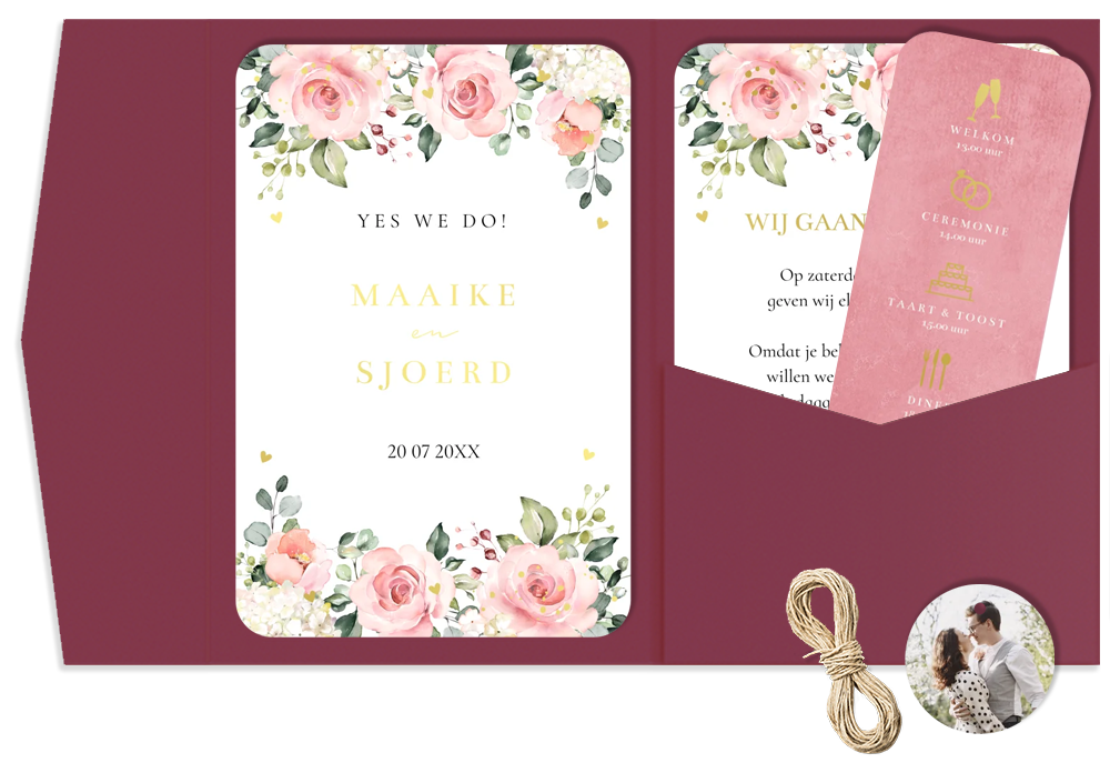 Stijlvolle pocketfold trouwkaart met roze bloemen en goudfolie. Bewerk alle kaartjes overzichtelijk bij elkaar in de editor en bestel de items gemakkelijk als set.