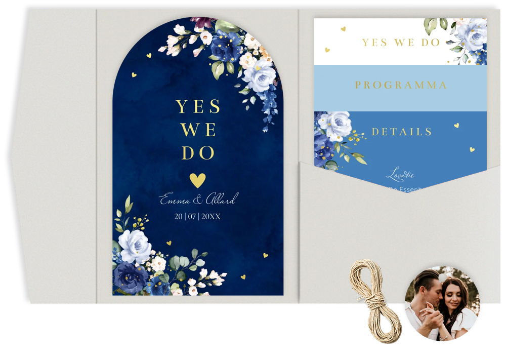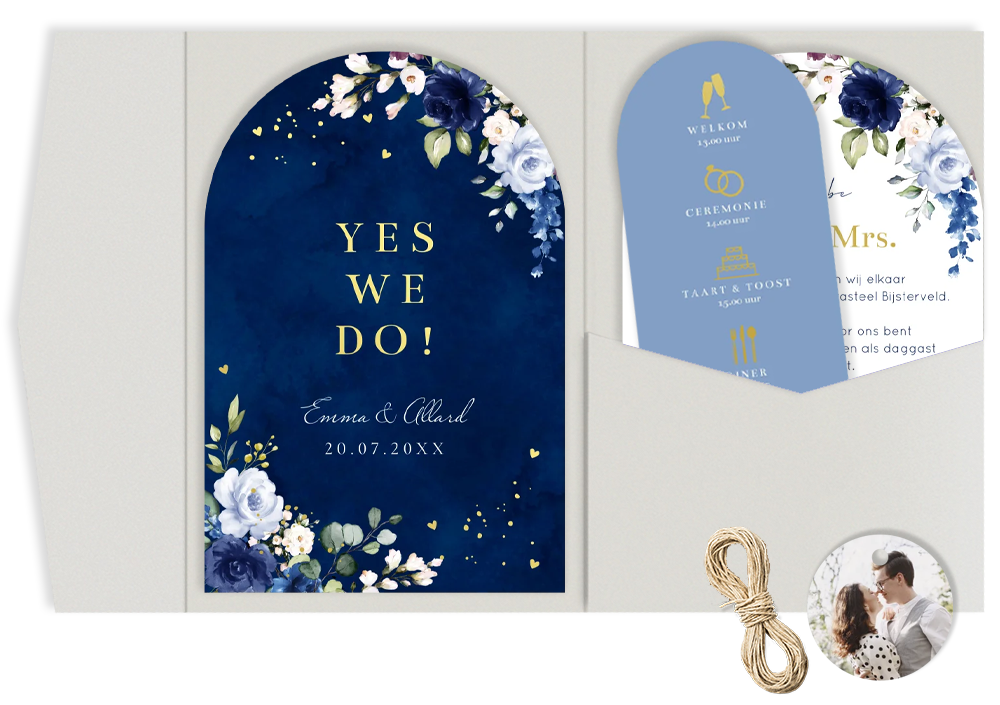 Pocketfold trouwkaart in boog vorm met Delfts Blauw watercolour bloemen en goudfolie. Bewerk alle kaartjes overzichtelijk bij elkaar in de editor en bestel de items gemakkelijk als set. Een pocketfold trouwkaart: hoe werkt het? • Eén kaart plak je aan de linker binnenzijde vast • In het vakje kun je de overige losse (foto)kaartjes kwijt • Maak de pocketfold dicht met mooi lint of touw, dit kun je er los bijbestellen. De envelop wordt automatisch in de juiste maat toegevoegd aan je winkelmand bij het bestellen van de set. Good to know: 2 postzegels * Getoonde prijzen zijn excl. de pocketfolds zelf, deze kun je tijdens het bestelproces toevoegen.