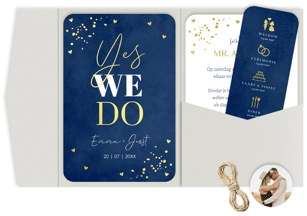 Stijlvolle pocketfold trouwkaart blauw met spetters, hartjes en goudfolie. Bewerk alle kaartjes overzichtelijk bij elkaar in de editor en bestel de items gemakkelijk als set. Een pocketfold trouwkaart: hoe werkt het? • Eén kaart plak je aan de linker binnenzijde vast • In het vakje kun je de overige losse (foto)kaartjes kwijt • Maak de pocketfold dicht met mooi lint of touw, dit kun je er los bijbestellen. De envelop wordt automatisch in de juiste maat toegevoegd aan je winkelmand bij het bestellen van de set. Good to know: 2 postzegels * Getoonde prijzen zijn excl. de pocketfolds zelf, deze kun je tijdens het bestelproces toevoegen.
