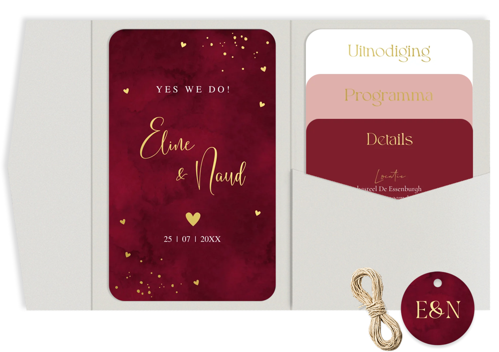 Stijlvolle trouwkaart pocketfold rood met trouw icoontjes en goudfolie. Bewerk alle kaartjes overzichtelijk bij elkaar in de editor en bestel de items gemakkelijk als set. Een pocketfold trouwkaart: hoe werkt het? • Eén kaart plak je aan de linker binnenzijde vast • In het vakje kun je de overige losse (foto)kaartjes kwijt • Maak de pocketfold dicht met mooi lint of touw, dit kun je er los bijbestellen. De envelop wordt automatisch in de juiste maat toegevoegd aan je winkelmand bij het bestellen van de set. Good to know: 2 postzegels * Getoonde prijzen zijn excl. de pocketfolds zelf, deze kun je tijdens het bestelproces toevoegen.