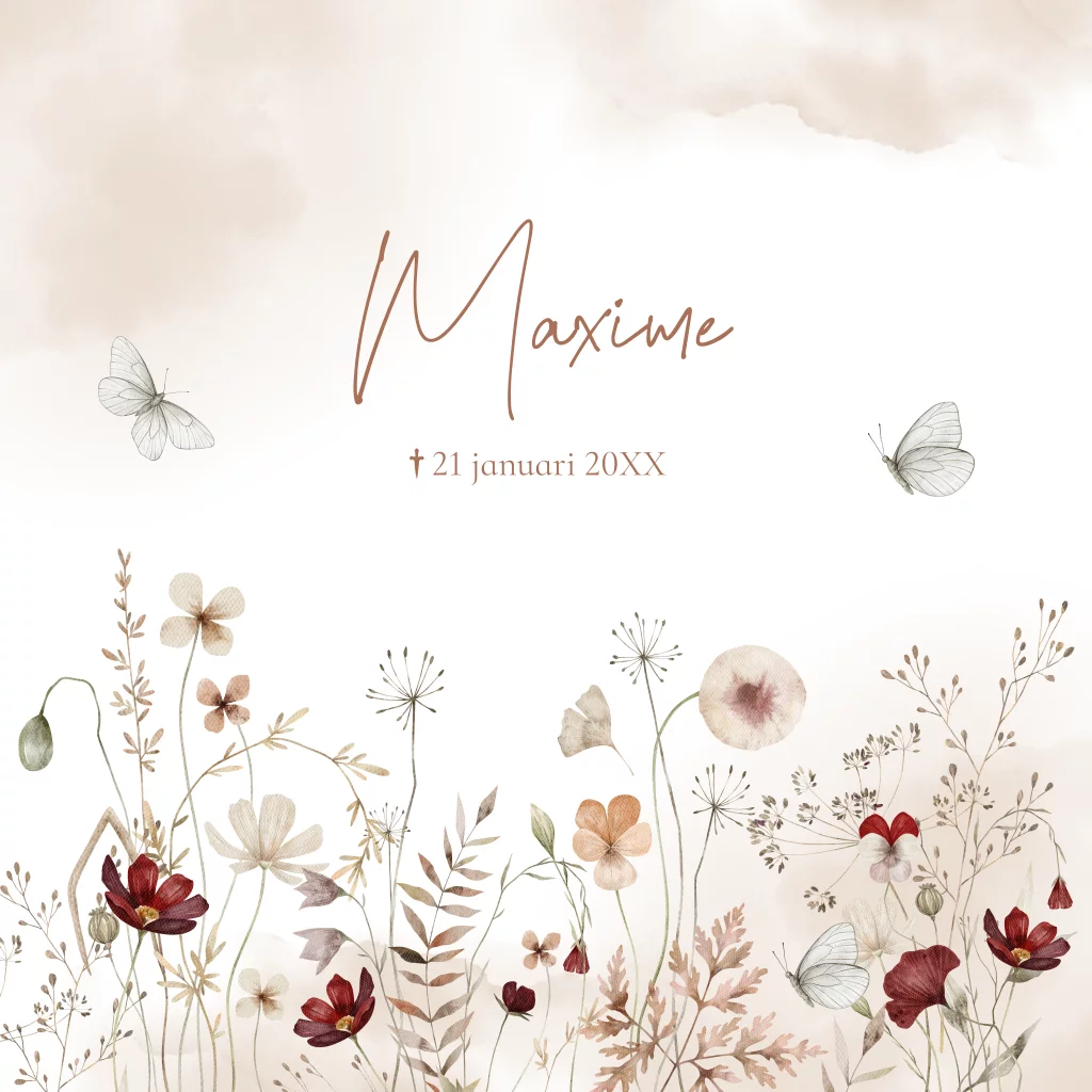 Prachtig rouwkaartje voor een baby of kind beige met veldbloemen, vlinders, blaadjes en takjes. Mooie doorlopende binnenkant met aanpasbare tekst.