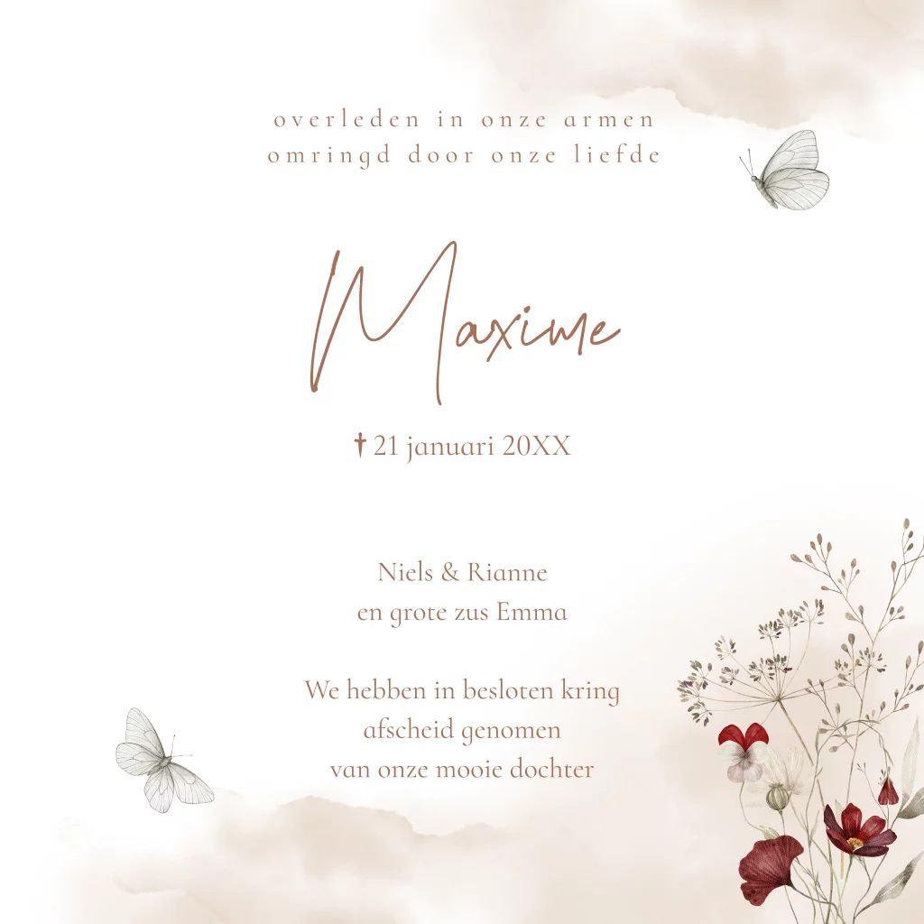 Rouwkaartje baby kind bloemen vlinders beige aquarel