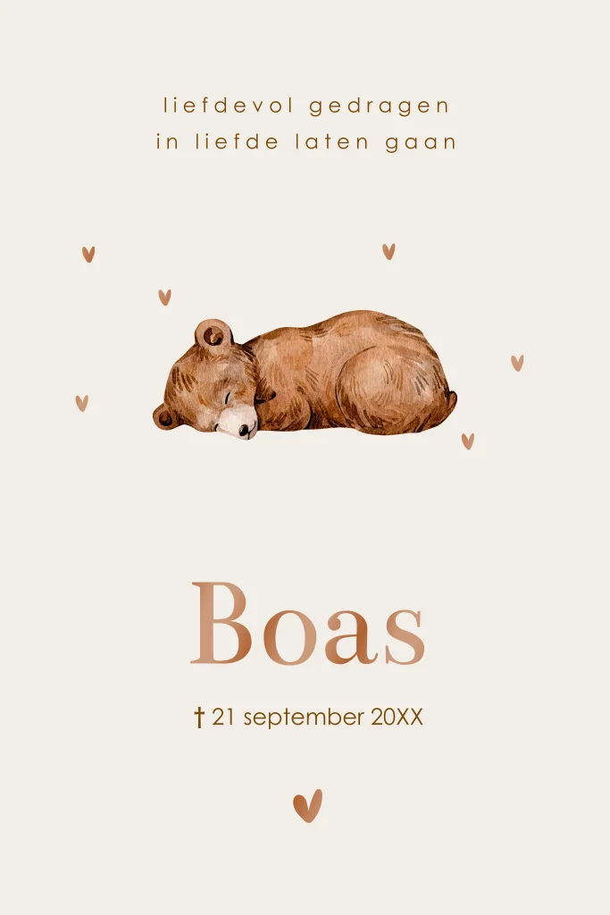 Mooi rouwkaartje voor een baby of kindje met slapend beertje, hartjes en hoogglans.