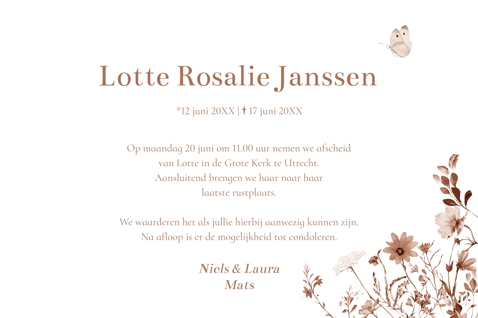 Op zoek naar een uniek rouwkaartje voor jullie kleine meisje? Kies dan voor dit prachtige beige kaartje met bloemen en vlinders. Met dit rouwkaartje geven jullie op een stijlvolle manier uiting aan jullie gevoelens. De combinatie van bloemen, vlinders en aardse kleuren symboliseert de kwetsbaarheid van het leven en de schoonheid van herinneringen.