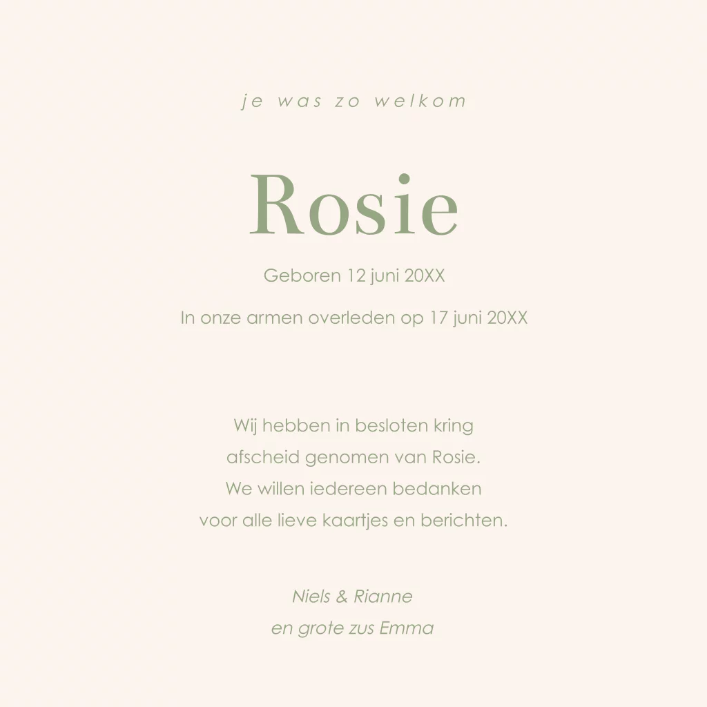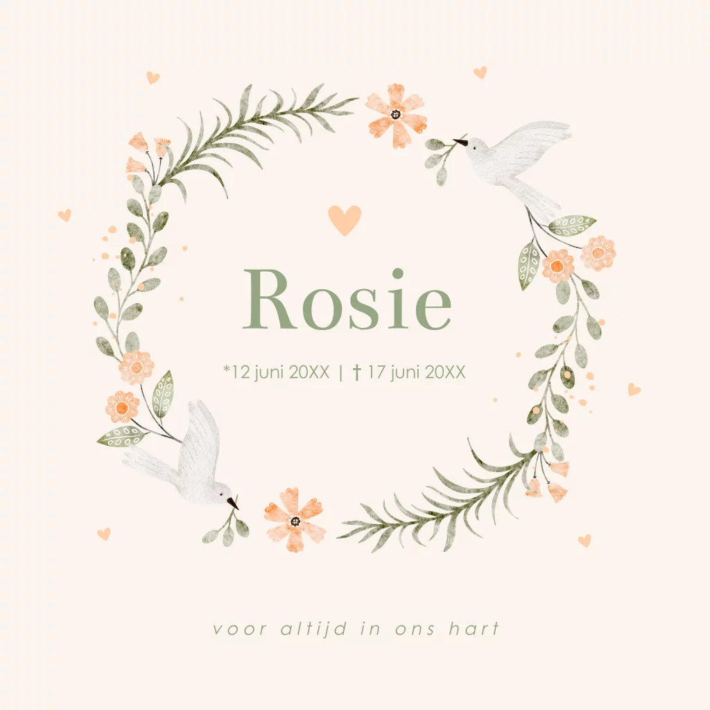 Rouwkaartje voor een baby meisje met bloemenkrans en vogels.