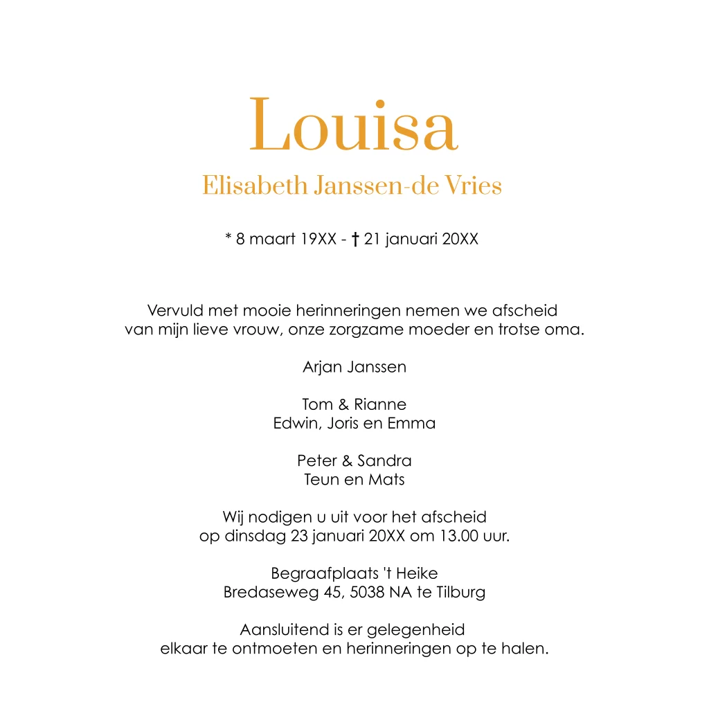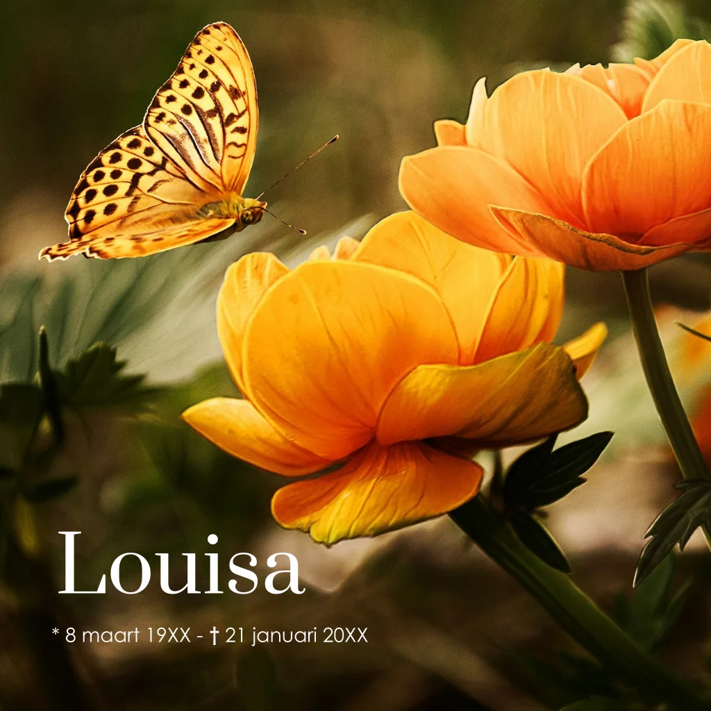 Rouwkaart vrouw bloemen vlinder geel oranje