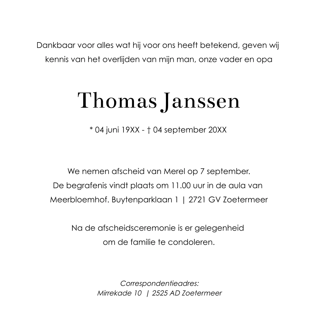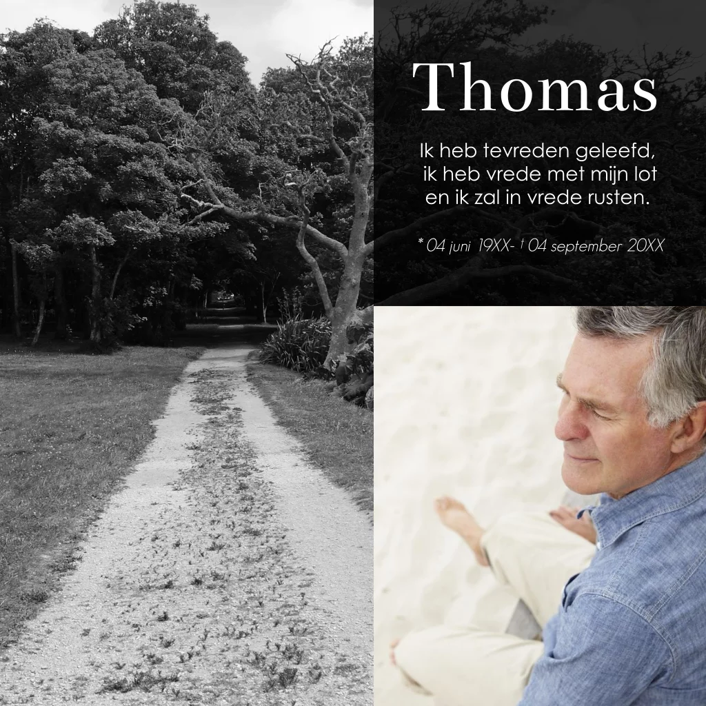 Moderne rouwkaart met eigen foto, vlakken zwart-wit en een foto van het bos.