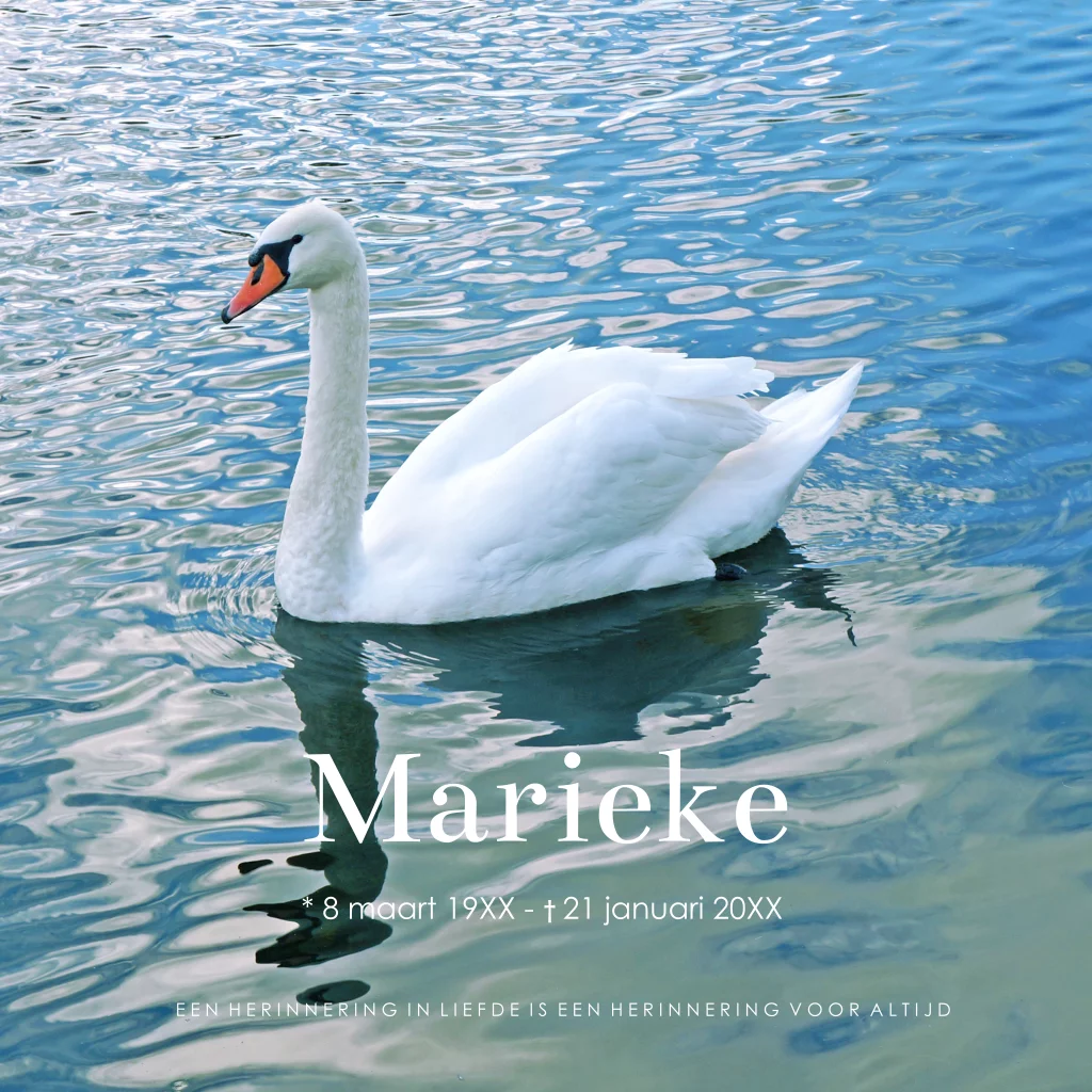 Mooie rouwkaart met zwaan in het water. Maak een persoonlijke rouwkaart met eigen tekst en of foto.