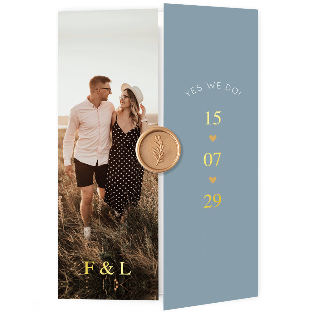 Moderne drieluik trouwkaart blauw met foto en met luxe goudfolie. Je vouwt de voorste twee 'deurtjes' naar binnen toe. Voeg zelf in de editor informatie toe over jullie trouwdag.