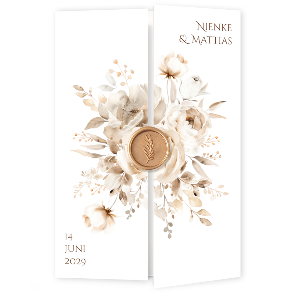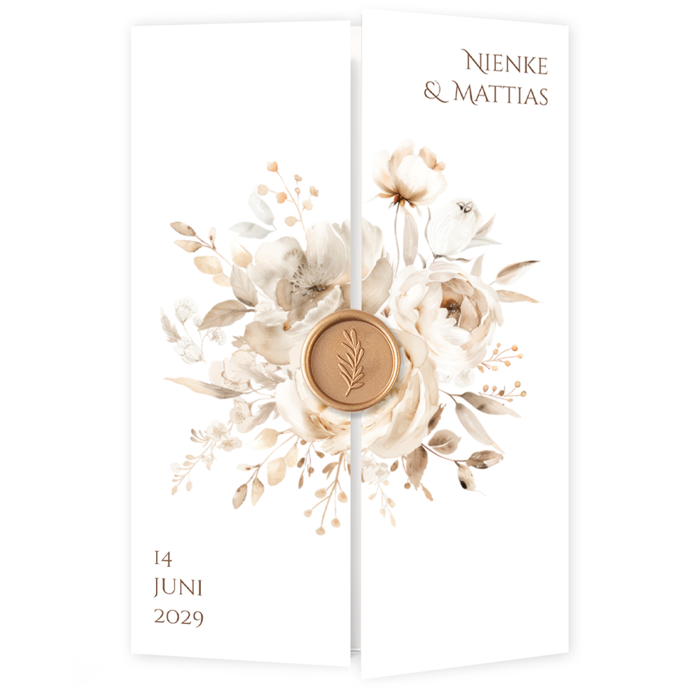 Originele drieluik trouwkaart wit met beige watercolour bloemen. Je vouwt de voorste twee 'deurtjes' naar binnen toe. Voeg zelf in de editor informatie toe over jullie trouwdag.