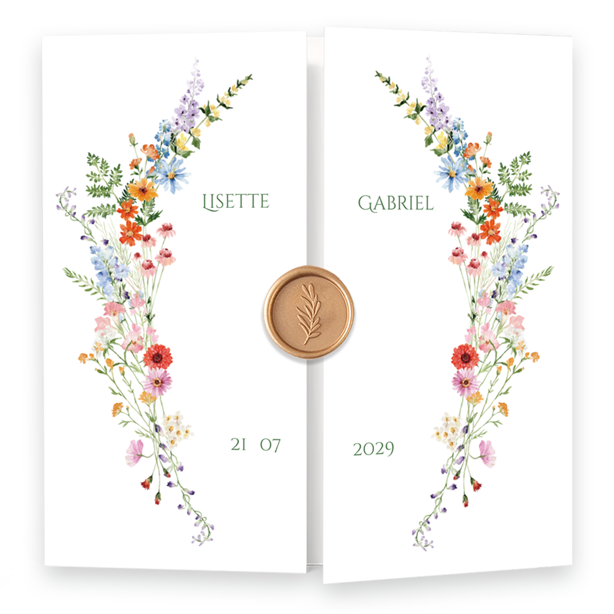 Originele drieluik trouwkaart met gekleurde bloemen. Je vouwt de voorste twee 'deurtjes' naar binnen toe. Voeg zelf in de editor informatie toe over jullie trouwdag. LET OP: Plaats je tekst of afbeeldingen niet te dicht op de rand, omdat de tekst er tijdens het drukken vanaf kan vallen. De veilige afstand tot de rand is aangegeven met arceringen.