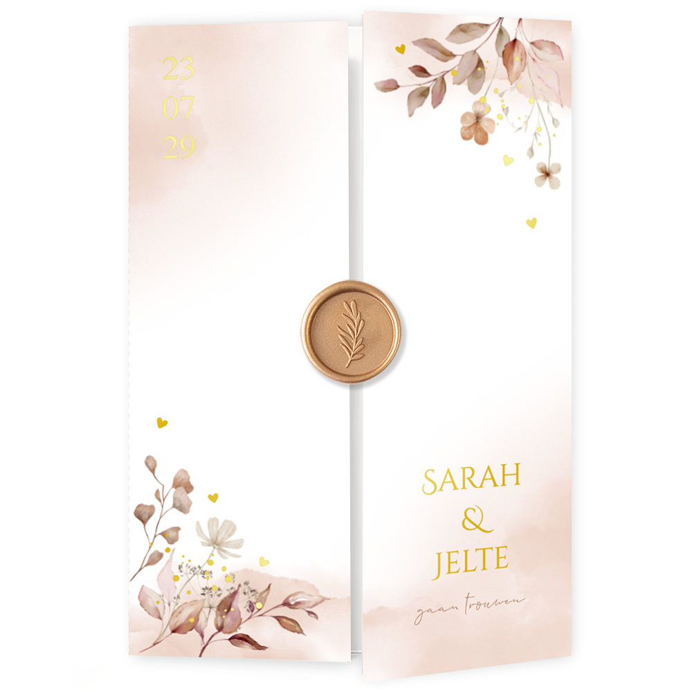 Originele drieluik trouwkaart met terracotta watercolour bloemen. Je vouwt de voorste twee 'deurtjes' naar binnen toe. Voeg zelf in de editor informatie toe over jullie trouwdag.