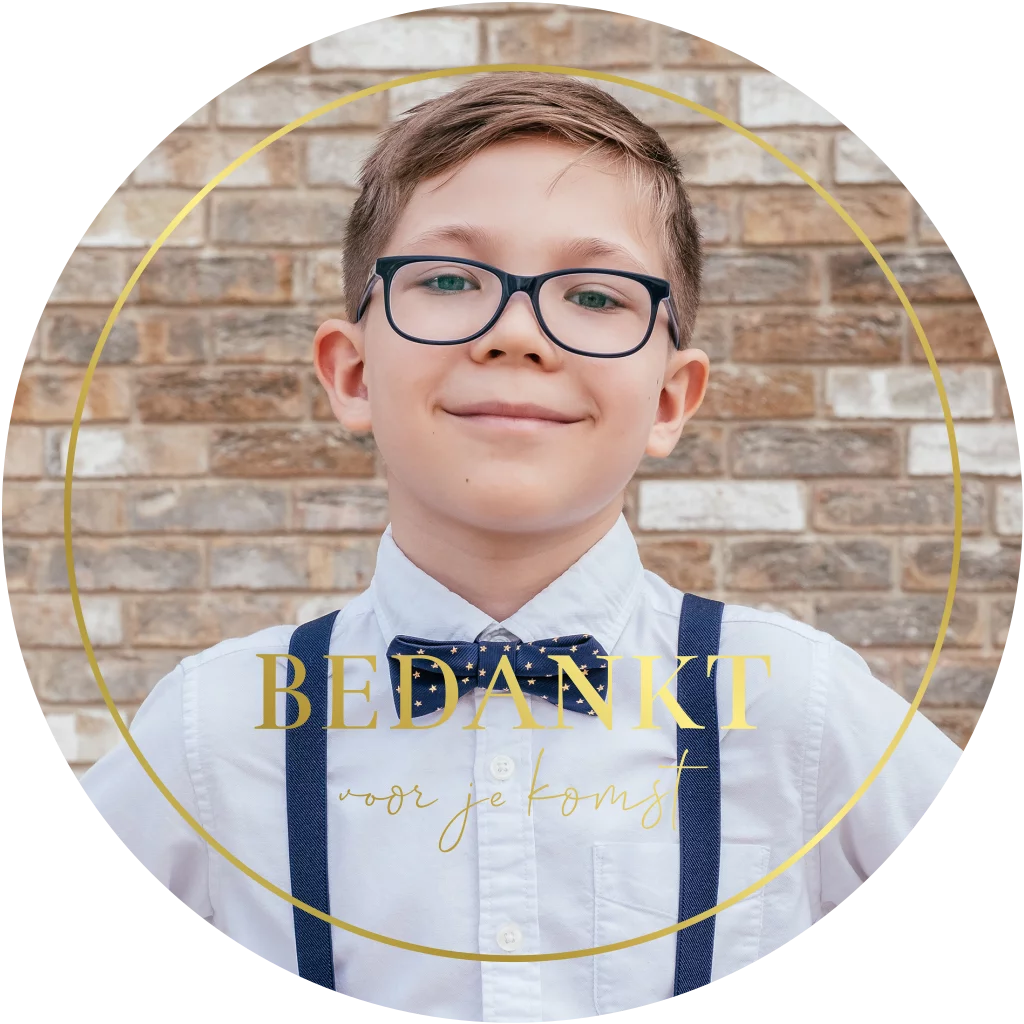 Bedankkaart communie voor jongen of meisje rond met eigen foto en goudfolie.