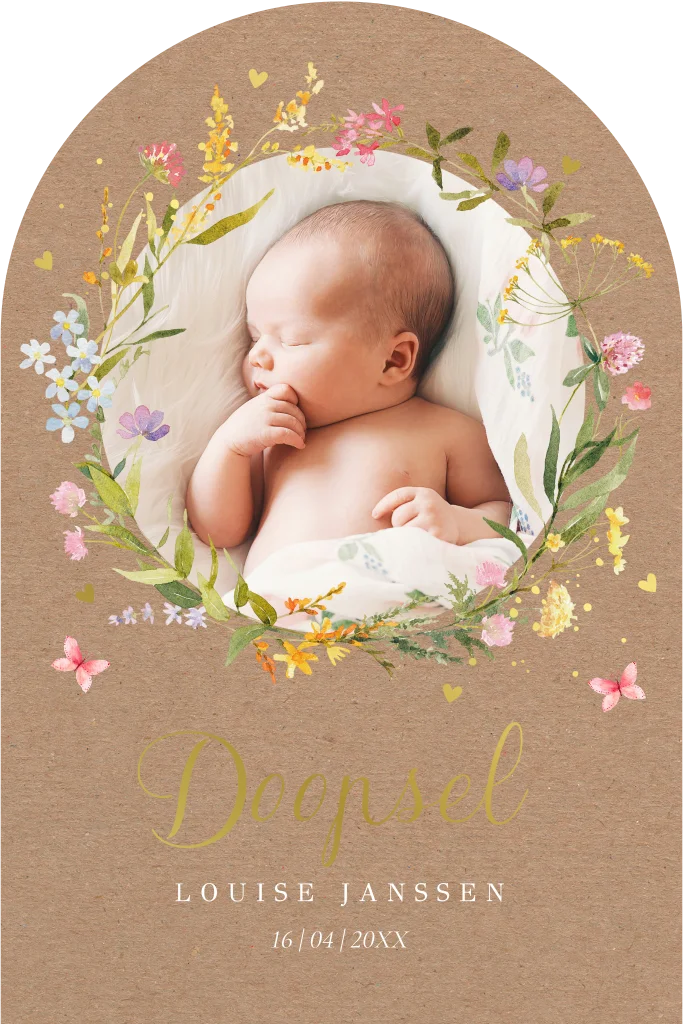 Doop uitnodiging voor een meisje in boog vorm met eigen foto, bloemen, kraft en goudfolie.