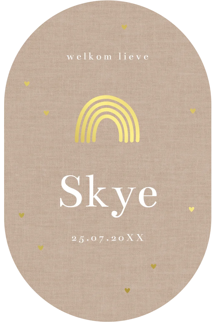 Geboortekaartje ovaal beige met regenboogje in goudfolie.