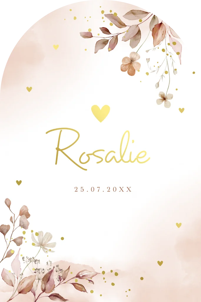 Geboortekaartje voor een meisje in boog vorm met bloemen en goudfolie.