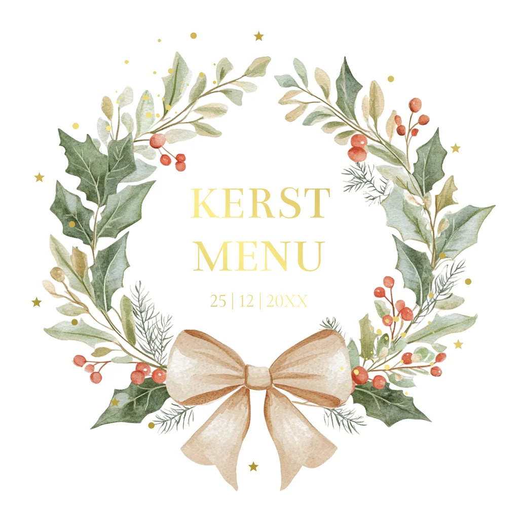 Kerstmenukaart rond wit kerstkrans strik goudfolie
