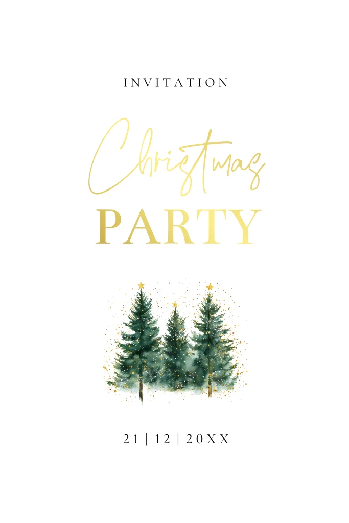 Luxe kerstborrel uitnodiging wit met golvend kader, groene kerstbomen en goudfolie.