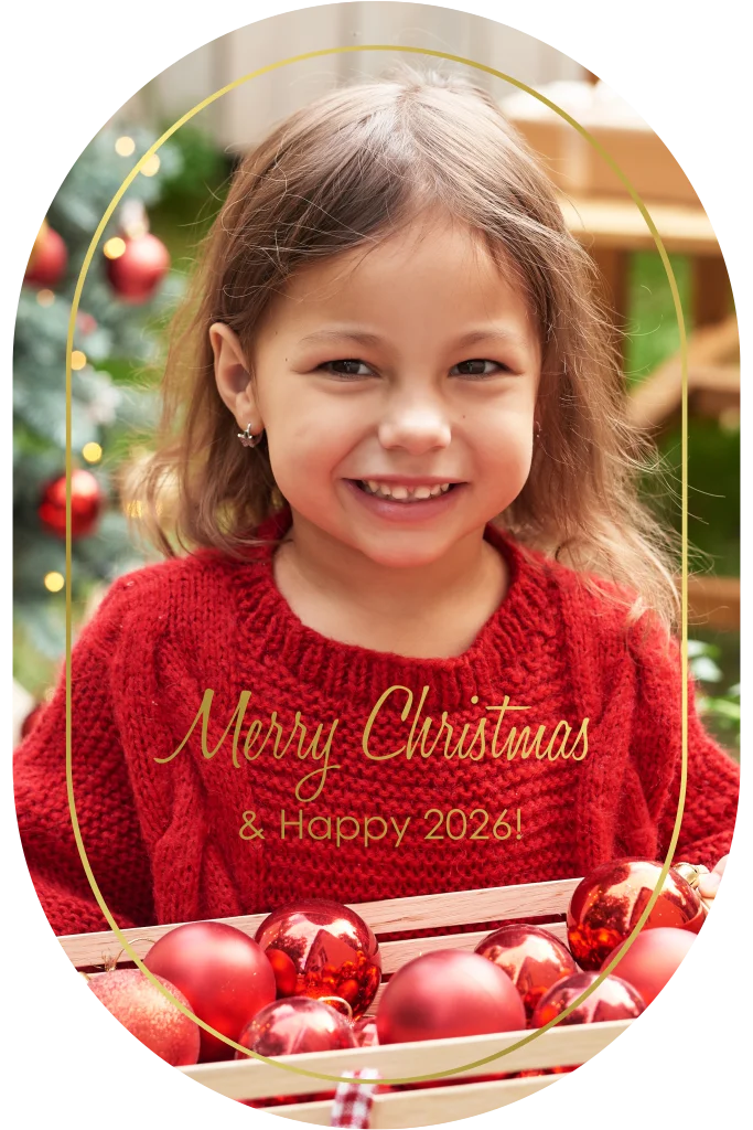 Kerstkaart ovaal eigen foto en goudfolie
