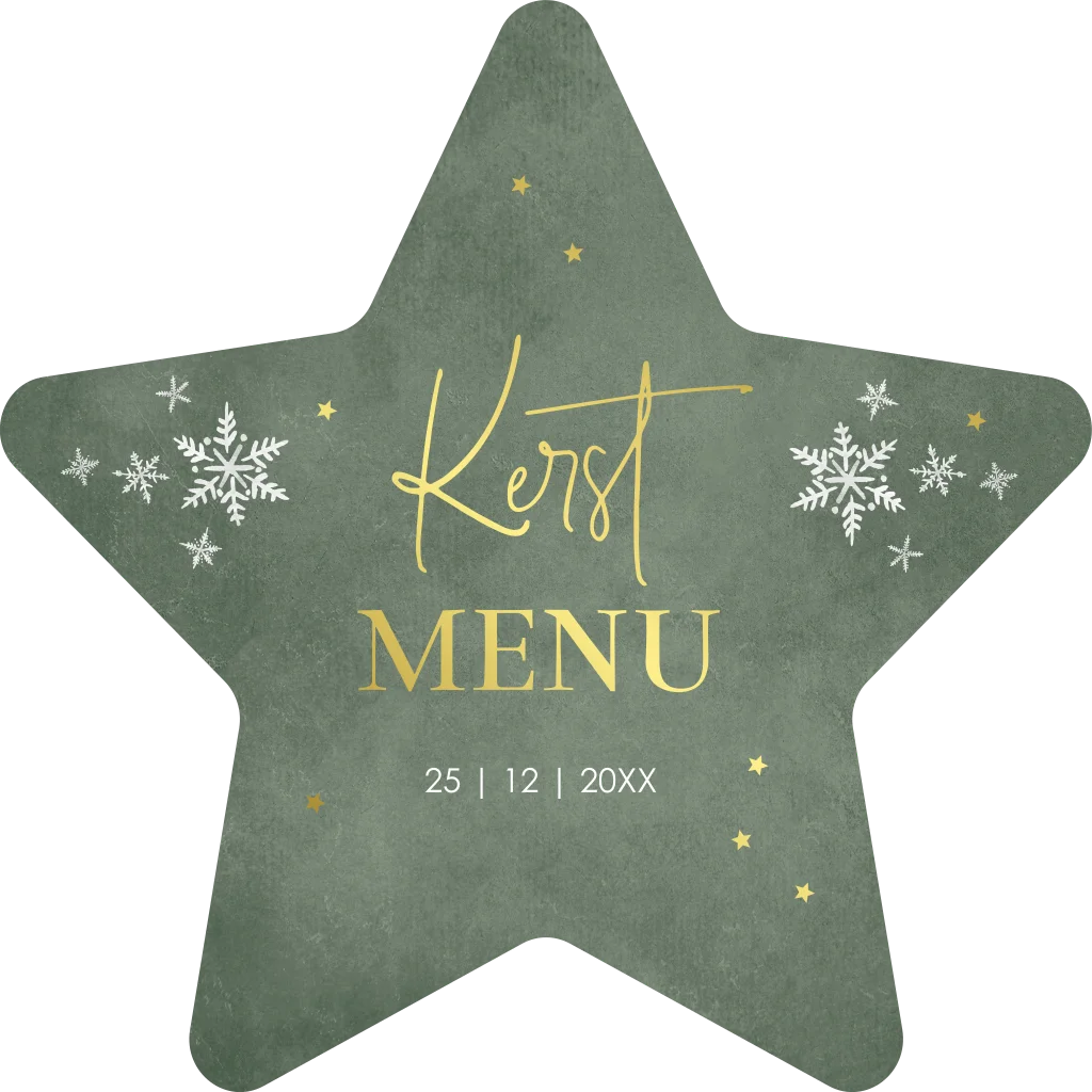 Kerstmenukaart in de vorm van een ster met blauwe achtergrond, sneeuwvlokken en goudfolie.