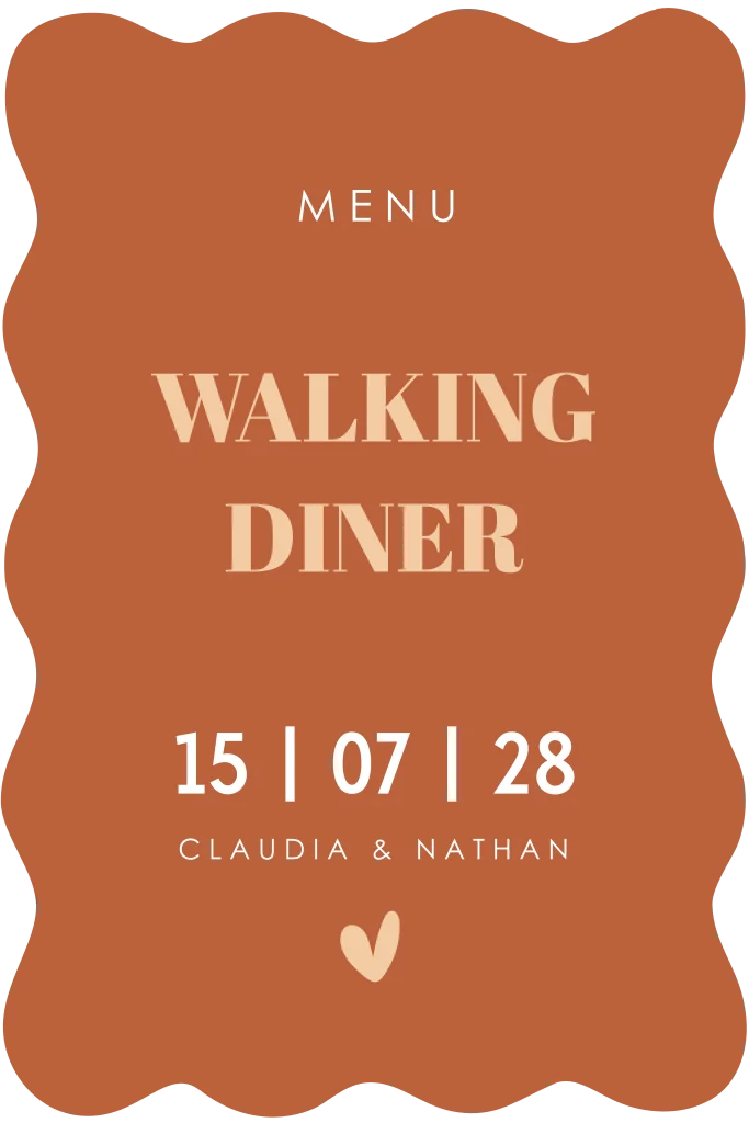 Stijlvolle menukaart roestbruin in boog originele vorm met moderne typografie.