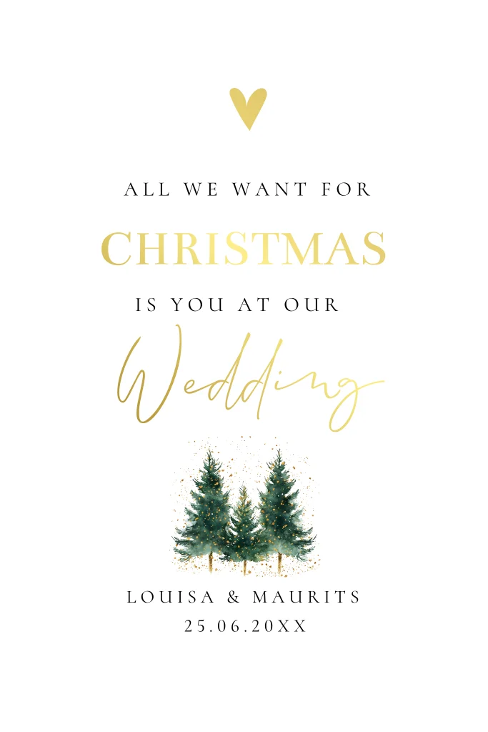 Klassieke en stijlvolle Save the Date kerstkaart in golvende vorm wit met kerstbomen en goudfolie. Liever een andere kleur foliedruk? Pas deze eenvoudig aan in onze ontwerptool.