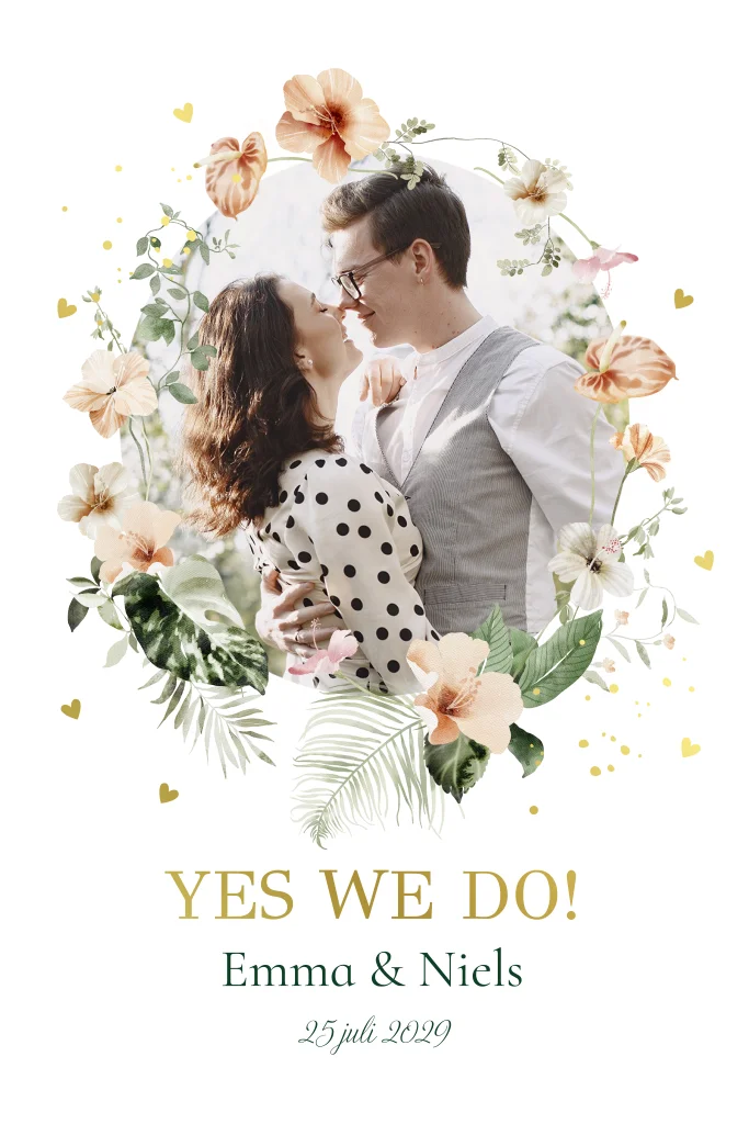 Trouwkaart in bijzondere vorm van een boog met foto, tropische bladeren en goudfolie. Perfect voor een strand thema bruiloft!