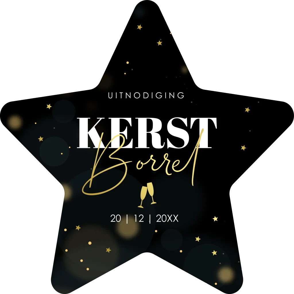 Kerstborrel uitnodiging in de vorm van een ster zwart met luxe goudfolie.