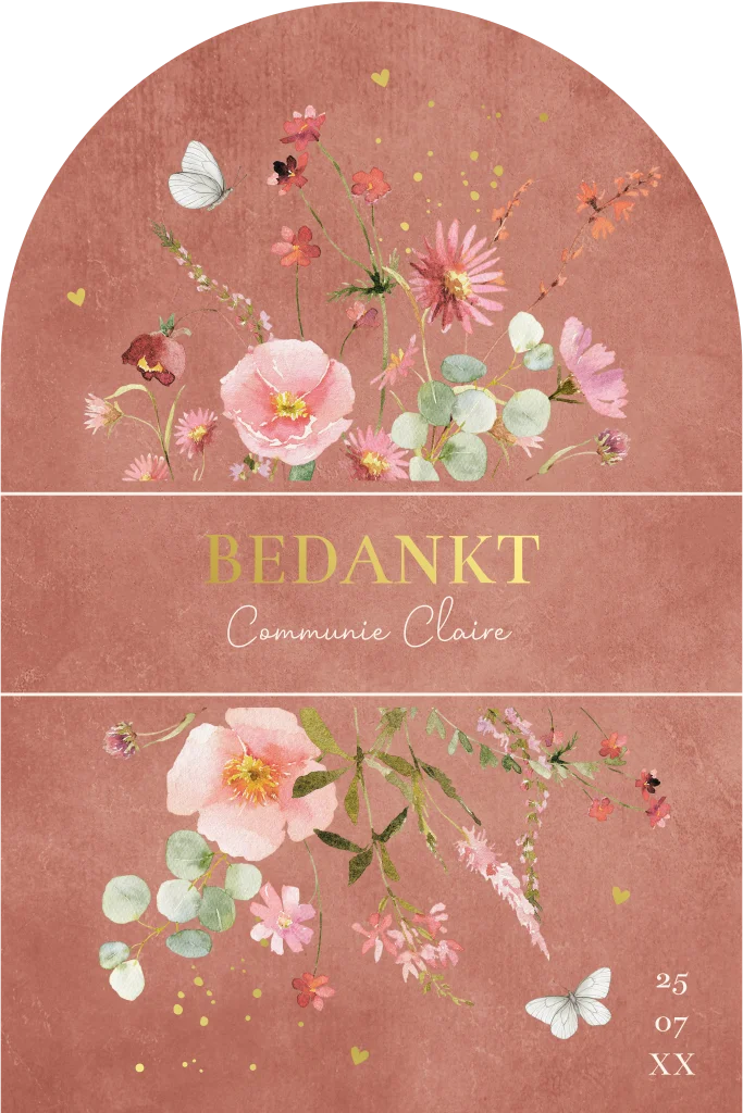 Bedankkaart communie meisje roze bloemen vlinders boog