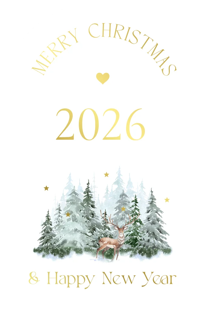 Een bijzondere kerstkaart wit in boog vorm met winterlandschap kerstbomen groen. Op de achterkant kan je een foto plaatsen en eigen tekst.