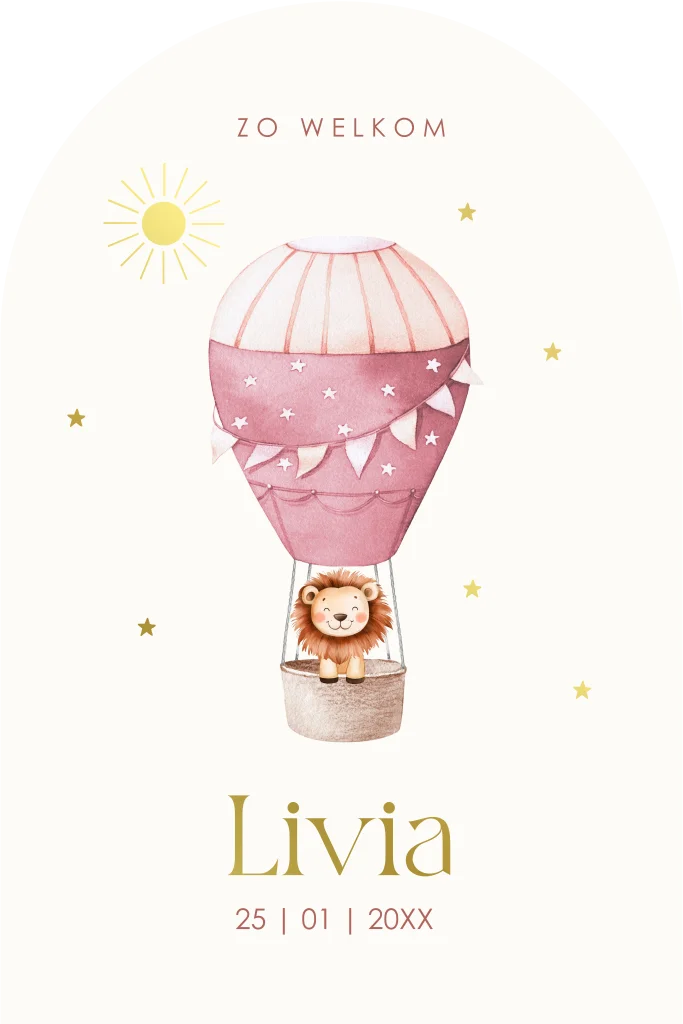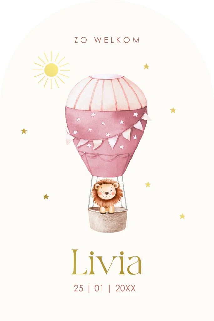 Lief geboortekaartje in boog vorm voor een meisje met roze luchtballon, leeuwtje en goudfolie.