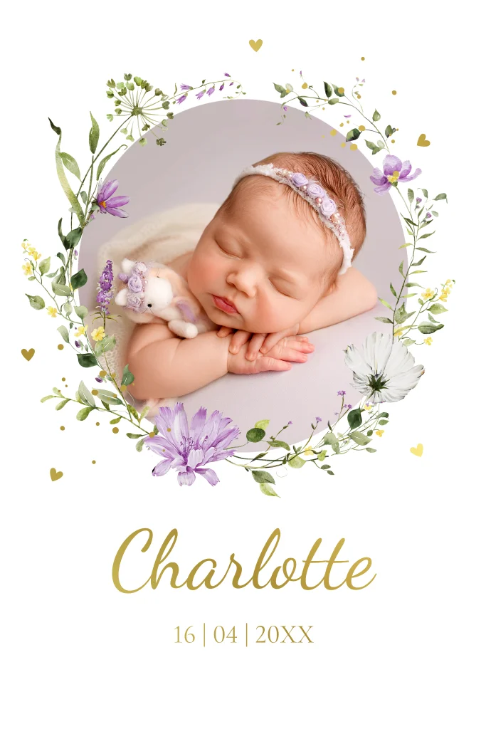 Geboortekaartje meisje foto bloemen paars goudfolie boog