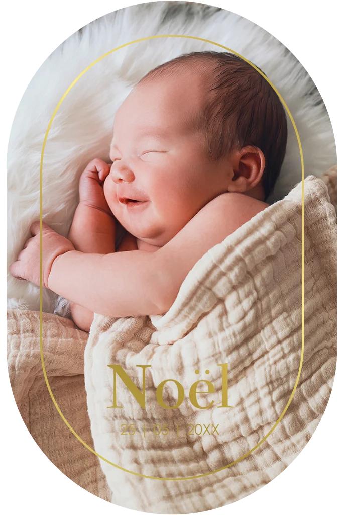Geboortekaartje in ovaal vorm met eigen foto, hartje, lijn en goudfolie.