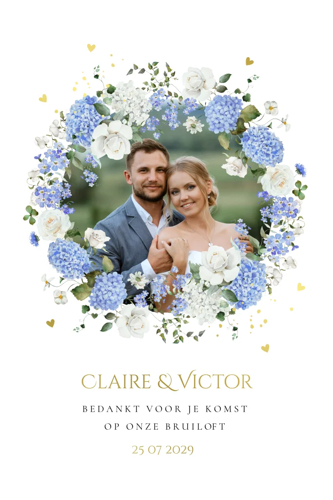Mooie landelijke bedankkaart met foto in boog vorm met watercolour bloemen blauw en goudfolie. Stuur deze mooie Save the Date kaart naar jullie gasten om de trouwdatum bekend te maken.