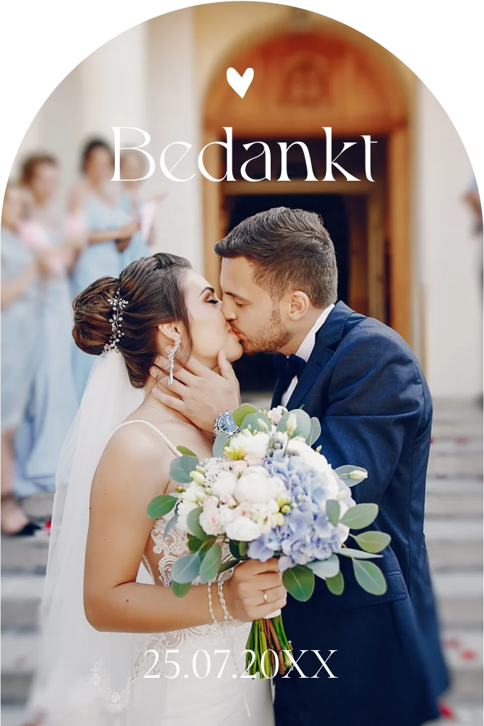 Stijlvolle bedankkaart huwelijk in boog vorm met eigen foto. Laat jullie bruiloftsgasten weten hoe geweldig de bruiloft was met deze stijlvolle bedankkaart!