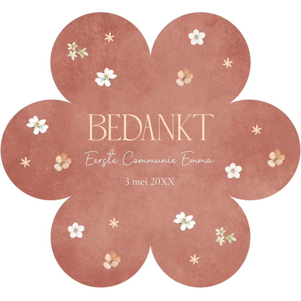 Bedankkaart communie voor een meisje in de vorm van een bloem roze. Op de achterkant kan je een foto plaatsen.