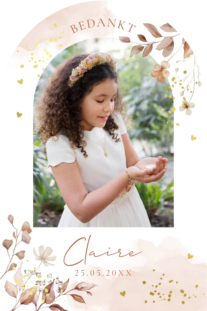 Bedankkaart communie voor een meisje in boog vorm met eigen foto, roze beige bloemen, bladeren en goudfolie.