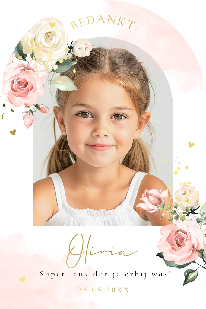 Bedankkaart in boog vorm voor een meisje met eigen foto, bloemen en goudfolie.