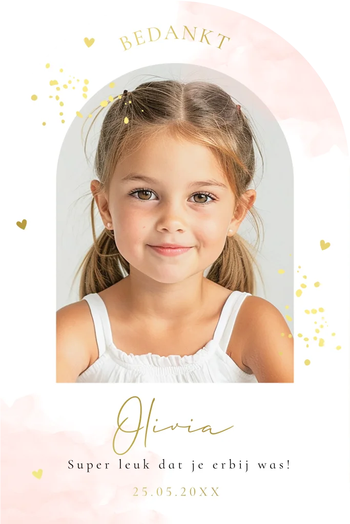 Bedankkaart in boog vorm voor een meisje met eigen foto en goudfolie.