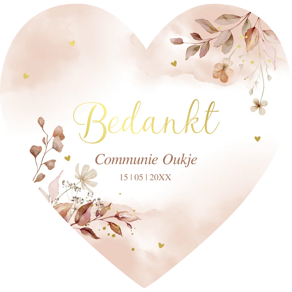Bedankkaart communie voor een meisje in de vorm van een hartje met bloemen terracotta roze, watercolour en goudfolie.