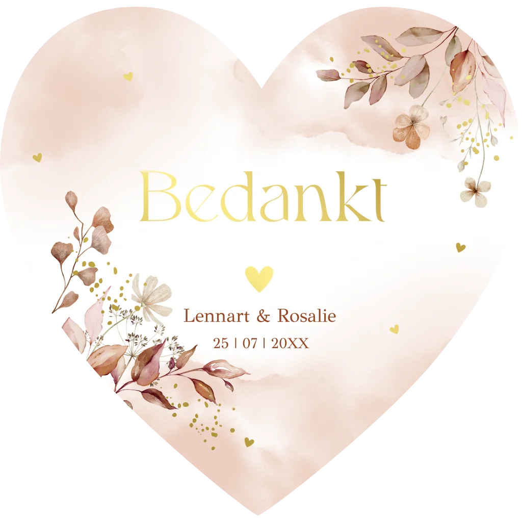 Bedankkaart huwelijk vorm hartje terracotta bloemen goudfolie