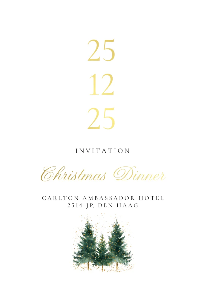 Christmas dinner uitnodiging wit kerstbomen goudfolie golvend