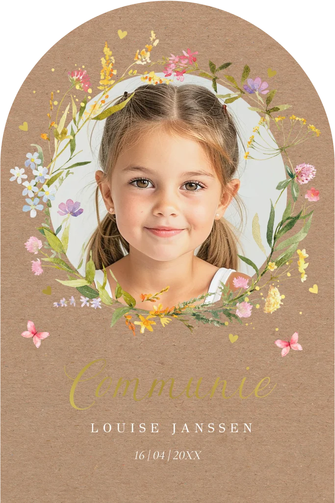 Communie uitnodiging meisje boog foto kraft bloemen goudfolie