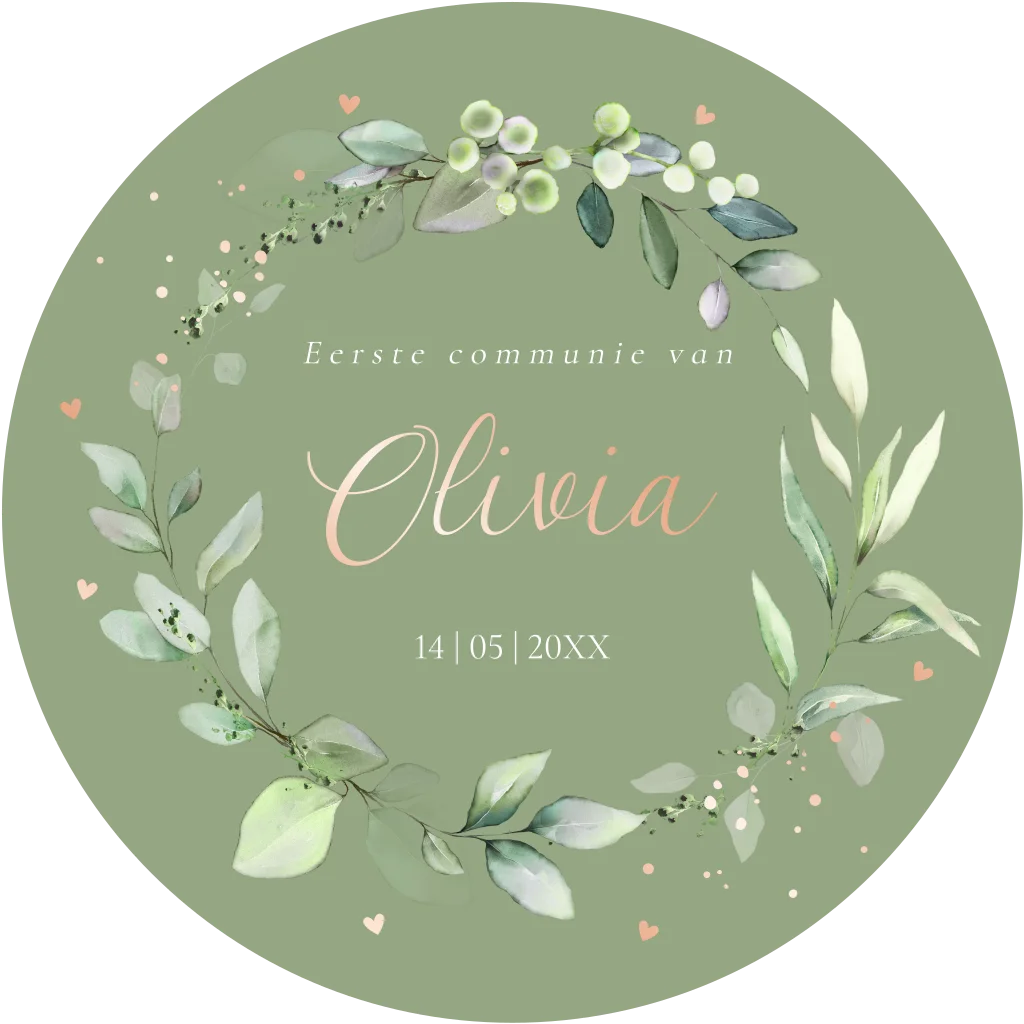 Communiekaart groen rond voor een meisje met krans van bladeren en foliedruk.