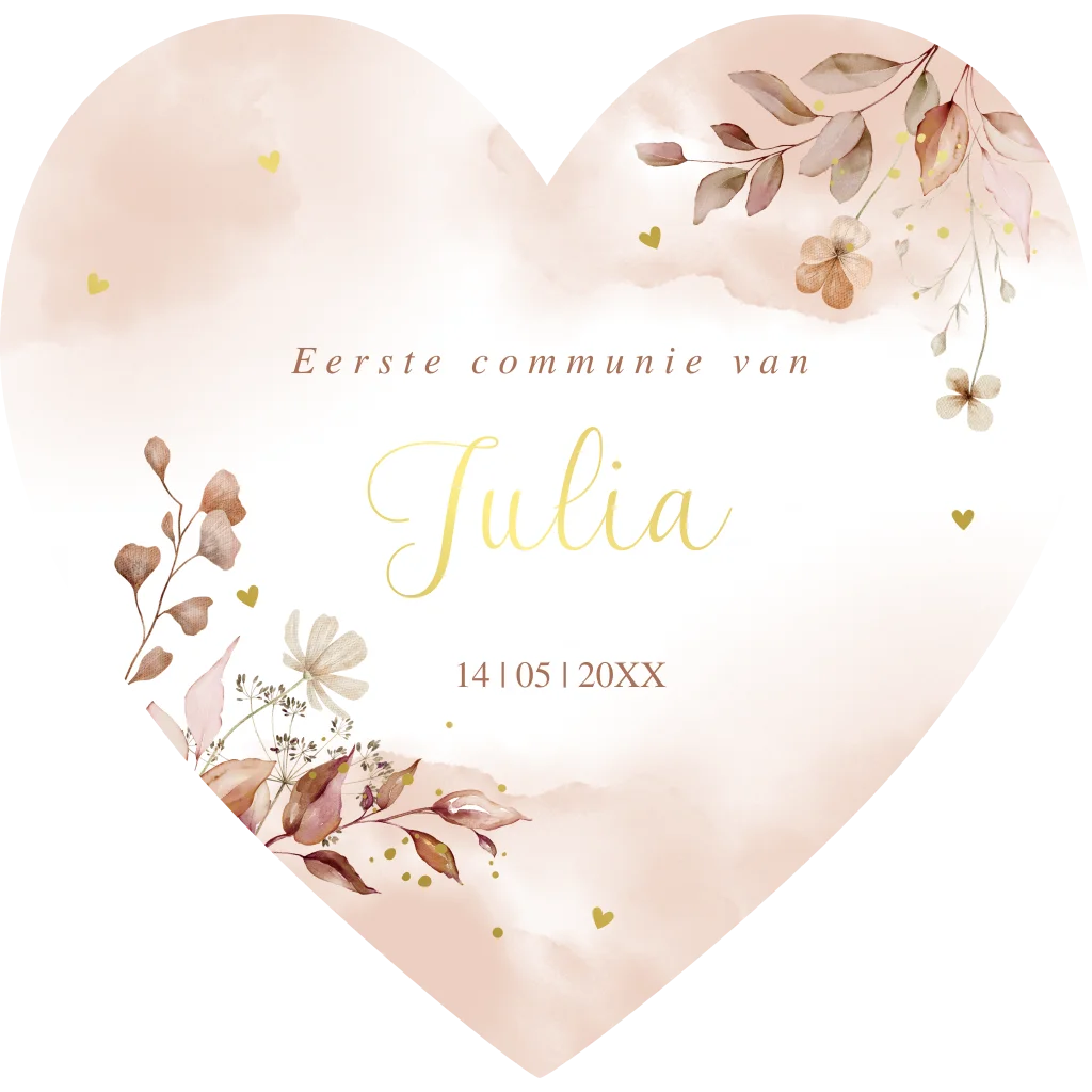 Communiekaart uitnodiging voor een meisje in de vorm van een hartje met bloemen terracotta roze, watercolour en goudfolie.