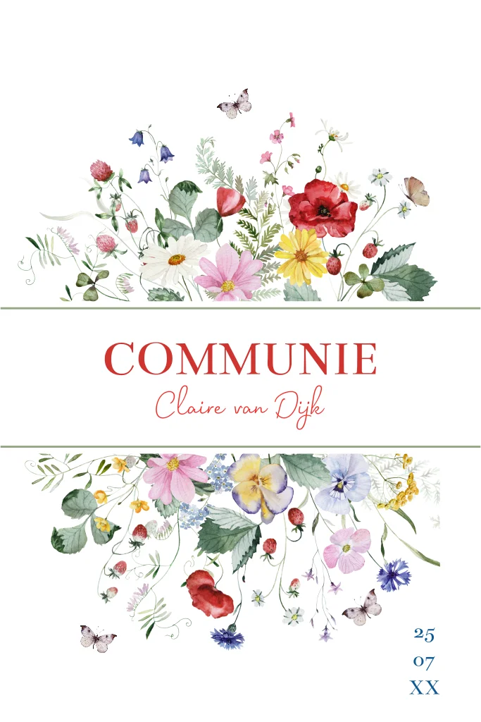 Communiekaart voor een meisje met fleurige bloemen roze in boog vorm.